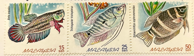 The three stamps above show a Peaceful Betta, a Three Spot Gourami and a Chocolate Gourami (Malaysia).