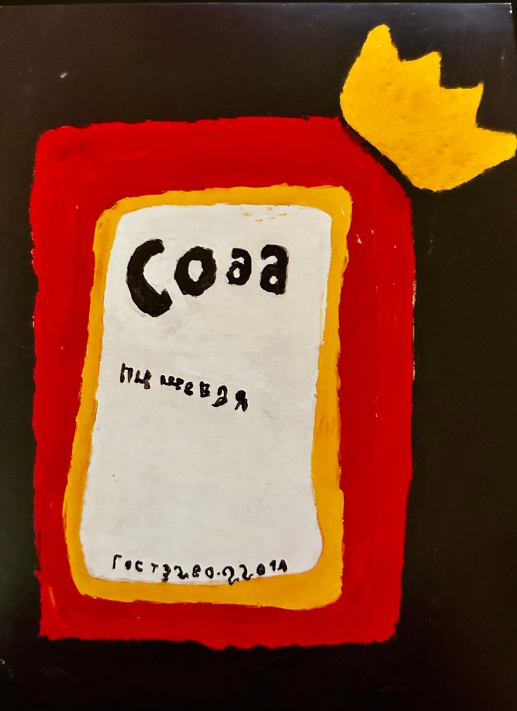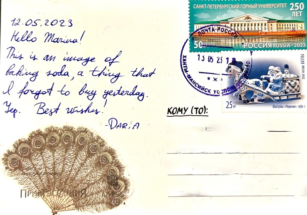 Interesting postcard from Russia. The writer explained that it is an image of a box of baking soda she forgot to buy the day before (funny!). I thought it was a Basquiat’s painting.