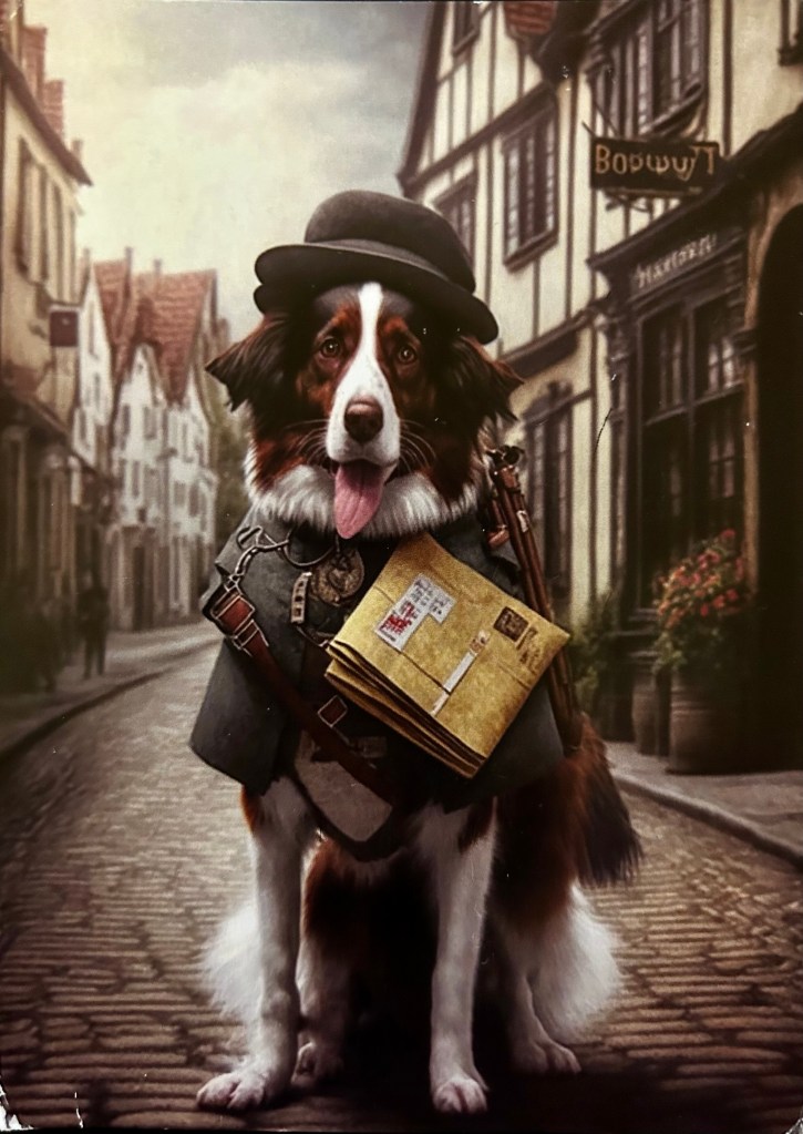 A sweet postcard titled “The Postman is a Kind of Joy Delivery man” . Anna Farudu.