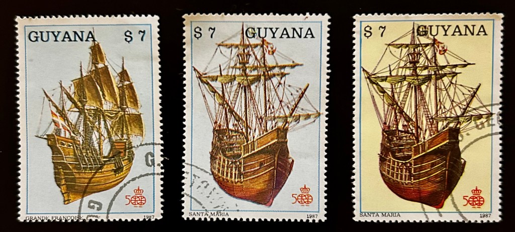 Guyana – 1988 Tall Ships: Left French four-masted sailing ship “grande Francoise” (1535) Center and Right Santa Maria, Columbus’ flagship.