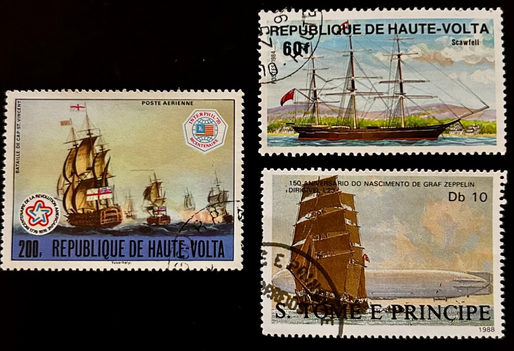 Left Republic of Upper Volta 1976 Bicentennial of American Revolution; Battle of Cape St. Vincent Top Right Republic of Upper Volta Sailing Ship “Scawfell”. Bottom Right 1988 São Tomé E Principe Sailing ship, dirigible and zeppelin.
