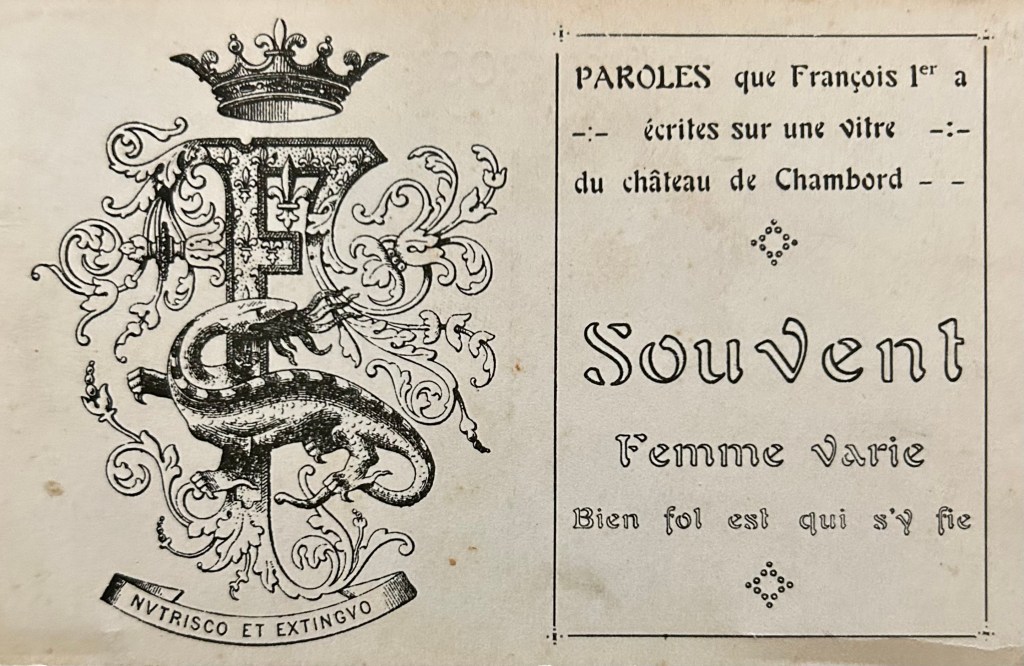 October 8, 2023July 22, 2025 marina Vintage Postcard From USA. Translation: Words that Francois I has written on a window of the castle of Chambord: “Often a female changes, very crazy who trust her” Sunday Sundries Share this: Click to share on Facebook (Opens in new window) Facebook Click to share on Pinterest (Opens in new window) Pinterest More Click to email a link to a friend (Opens in new window) Email Click to share on Tumblr (Opens in new window) Tumblr Click to share on X (Opens in new window) X Like Loading... Related