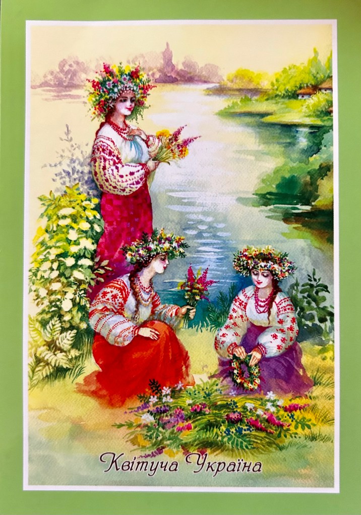 A number of activities and rituals are associated with Kupala Night: such as, gathering herbs and flowers and decorating people, animals and houses with them; entering water, bathing or dousing with water and sending garlands on water, as depicted on this postcard.