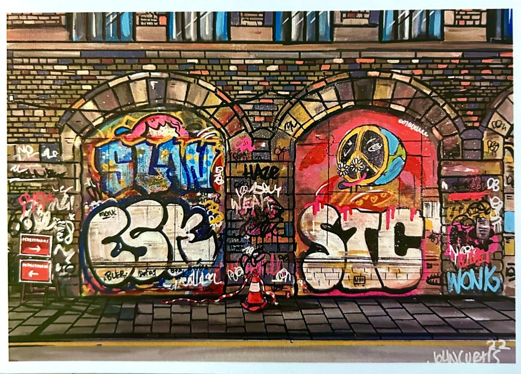 This is a spray painting on canvas of the graffitis on the Carriegeworks building in Bristol, England. By John Curtis