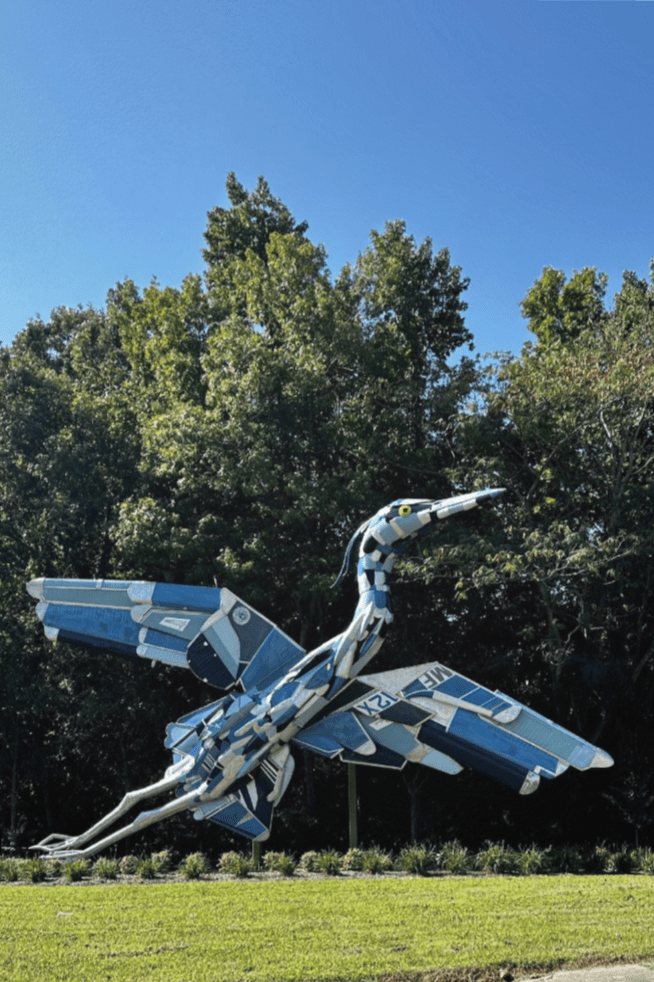 The 24-foot tall monument with its 44-foot wingspan was created by Don Kennell and Lisa Adler of DKLA Design of Santa Fe, NM. The sculpture celebrates the miracle of flight and Norfolk, Virginia – a place blue herons call home.