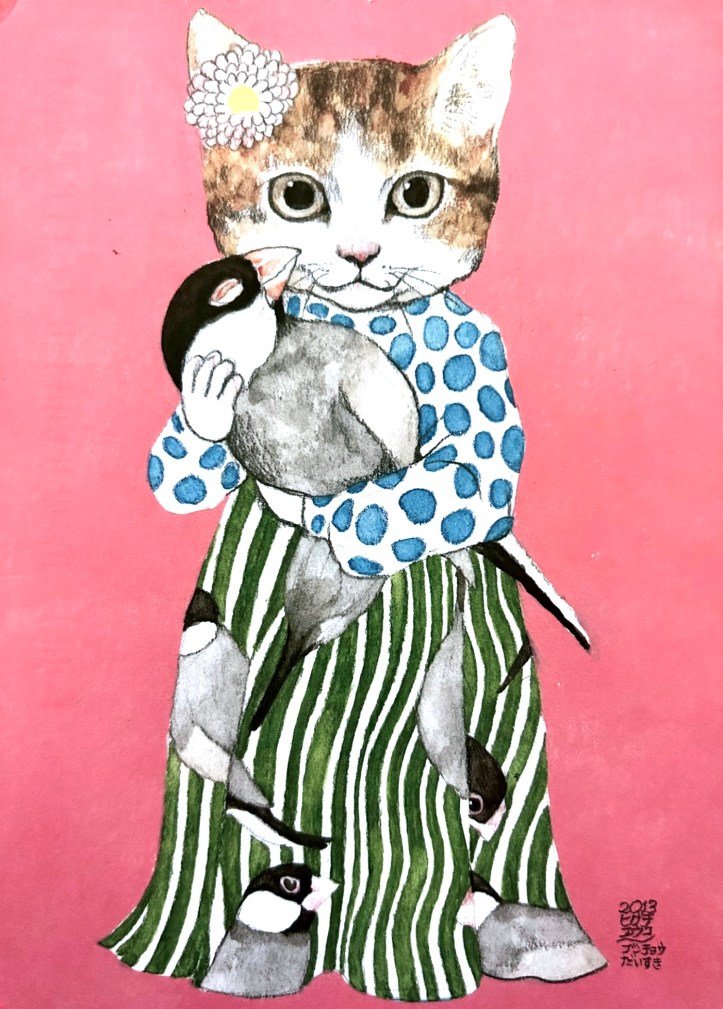 1. The Japanese image is quite interesting. The bird fabric, and the same type of bird in arms. She looks like she’s holding it tenderly, but knowing cat’s facial expressions, I am not so sure! The bird may have been rocked to sleep. Or? Maybe lunch?