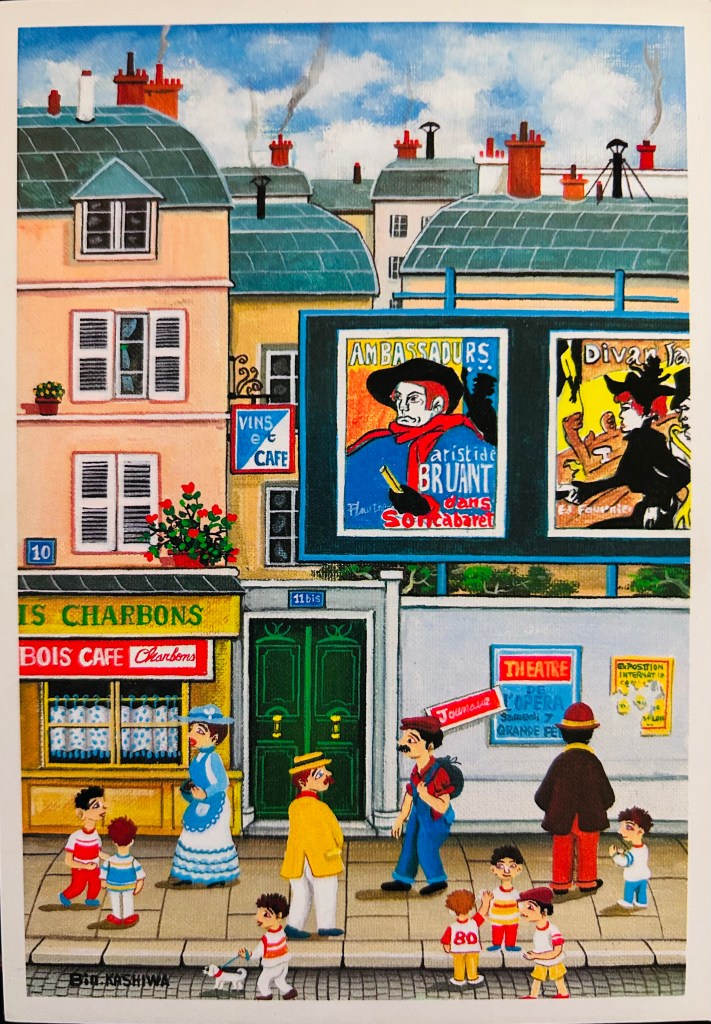 Affichage by Bin Kashiwa – Bin Kashiwa (real name: Toshikazu Kashiwazaki, May 15, 1944 – September 6, 2023) is a Japanese painter. He began his career as a hotel worker but was captivated by the world of Henri Rousseau and suddenly began his career as a painter. He painted for tourists on the hills of Montmartre in Paris. His “Streets of Paris” of the good old days, the world of imagination “Paradise”, and his “Family” series, based on human love, and the fairy tale world he depicts, have captured the hearts of many people.