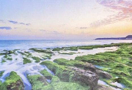 The Laomei Green Stone Trough is located in Laomeili, Shimen District, New Taipei City. It was originally a volcanic reef left on the coast after the eruption of the Datun volcano. Due to long-term wave erosion, the soft parts were eroded, leaving a harder one. Part of it forms a vertical groove. It is a scenic spot in Taiwan. During April and May, algae cover the stone troughs in a vibrant green. The algae-covered rocks are very slippery and dangerous, so visitors should not walk on them.