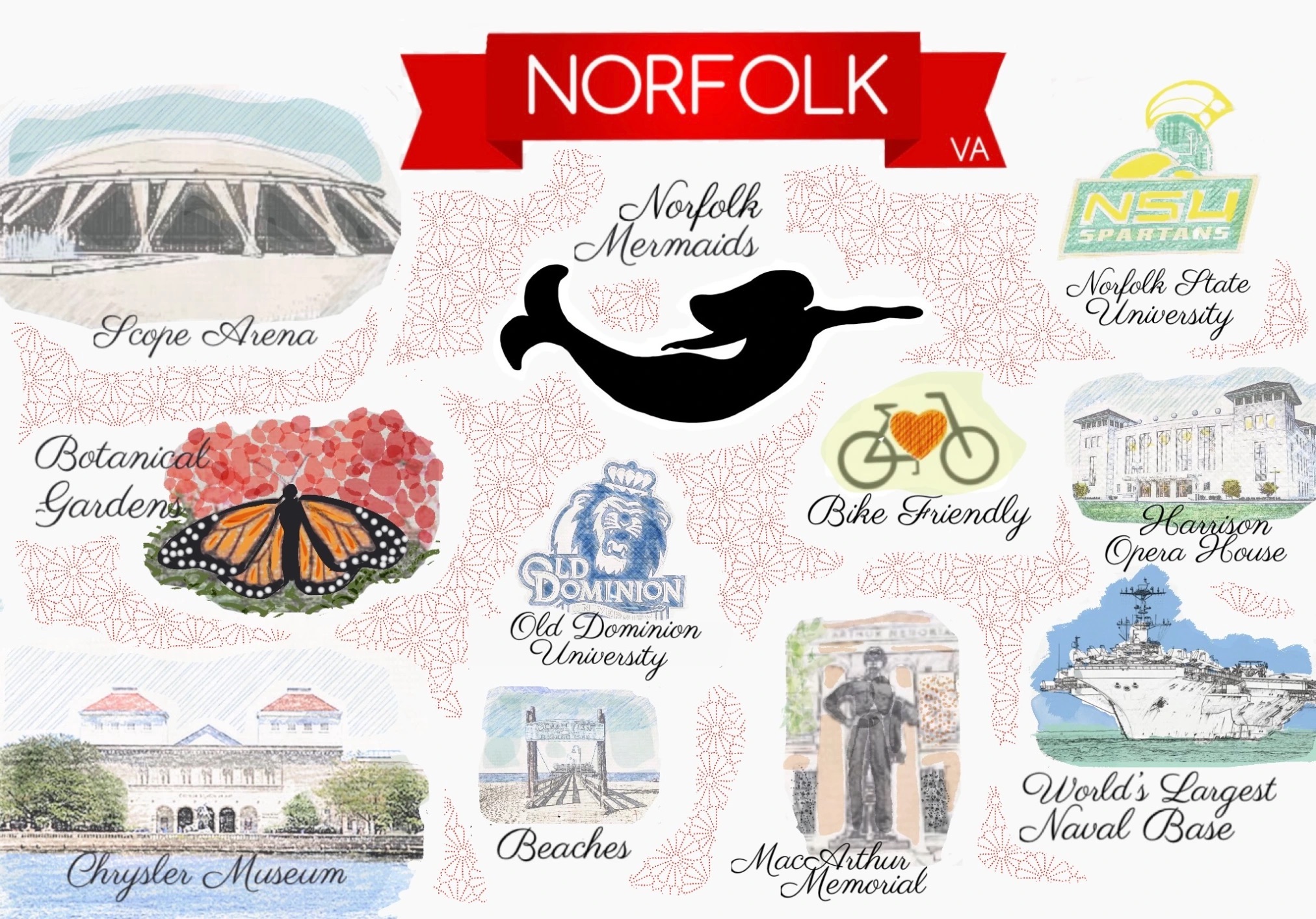 An early English settlement, Norfolk is filled with historic sites and monuments. It is also home to a massive naval base on Chesapeake Bay. The Chrysler Museum of Art, considered one of the Top 20 museums in the USA, features masterworks from every major civilization, historical period, and culture of the past 5,000 years. It showcases a vast collection of glass art, European and American paintings, and sculpture. The Norfolk Mermaidsare life-size mermaid sculptures placed throughout the city by local artists and businesses to celebrate Norfolk’s maritime heritage. These sculptures dot the city, serving as a popular attraction and an official city symbol, with an interactive map available to help find them on a “mermaid treasure hunt”.