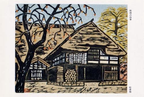 Japanese woodblock print, a modern ukiyo-e style artwork. It depicts an autumn scene: a traditional Japanese house with a thatched roof, surrounded by trees laden with orange fruit, possibly persimmons. The text on the image identifies the location and theme as “Akita’s Four Seasons”. Akita is a prefecture in northern Japan. The artist’s name is Matsubara Hidenori.