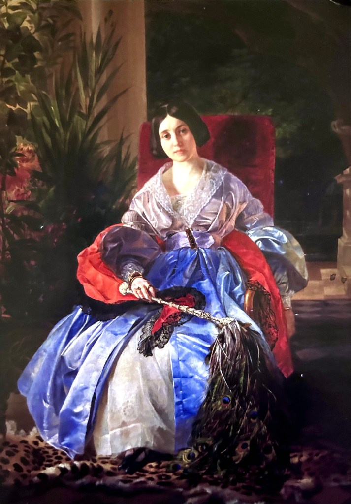 The subject, Princess Saltykova, is depicted with a peacock feather fan, showcasing the fashion and craftsmanship of the era.