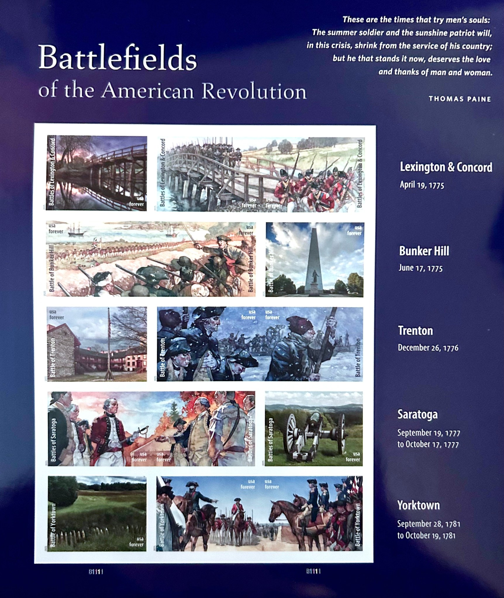 USA – 2025 Battlefields of the American Revolution. In preparation for the 250th anniversary of the United States, these stamps honor the battlefields where so many sacrificed to make our celebration possible. The stamp pane pairs photographs of five battlefields and historic sites with dramatic paintings of pivotal moments in the American Revolution by artist Greg Harlin, whose illustrations span two stamps each. Art director Derry Noyes designed the stamp pane.