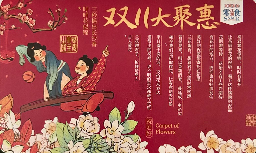 April 12, 2026February 7, 2026 marina Singles’ Day Postcard from China Promotional advertisement for a “Double 11” (Singles’ Day) shopping Festival snack sale. The text includes poetic descriptions comparing friendship to flowers and wishing prosperity. Sunday Sundries Share this: Share on Facebook (Opens in new window) Facebook Share on Pinterest (Opens in new window) Pinterest Share on Tumblr (Opens in new window) Tumblr More Email a link to a friend (Opens in new window) Email Share on X (Opens in new window) X Like Loading... Related