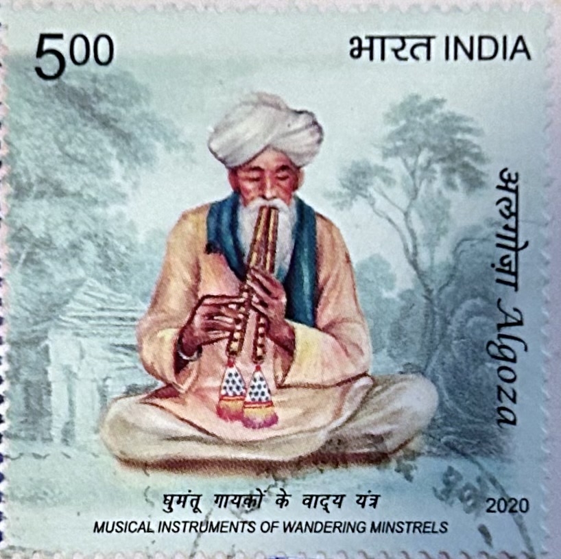 India – 2020 Minstral playing alghoza – Series: Musical Instruments of Wandering Minstrels. Alghoza, also called Beenon, is a paired woodwind traditional musical instrument of Sindhi culture, also used by Kutchi, Saraiki, Punjabi, Rajasthani, and Baloch folk musicians. It consists of two joined beak flutes, one for melody, the second for drone.
